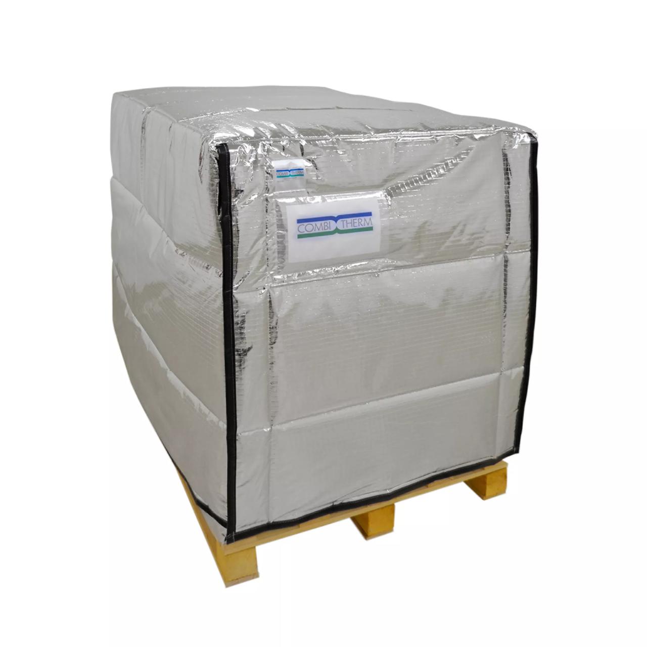 The thermo pallet hood is safe to use when transporting frozen and cool goods, or frost sensitive products. The pallet hood has low weight and is quick and easy to use. It is produced with a metal foil as an outer casing, which has a very good reflective property (90% of solar radiation energy is reflected by this material). The foil is very resistant to abrasion and demolition and thereby combines excellent solar radiation protection with very good mechanical properties. As standard the covers have front or center opening and are insulated with 300 g polyester fibers per sqm.