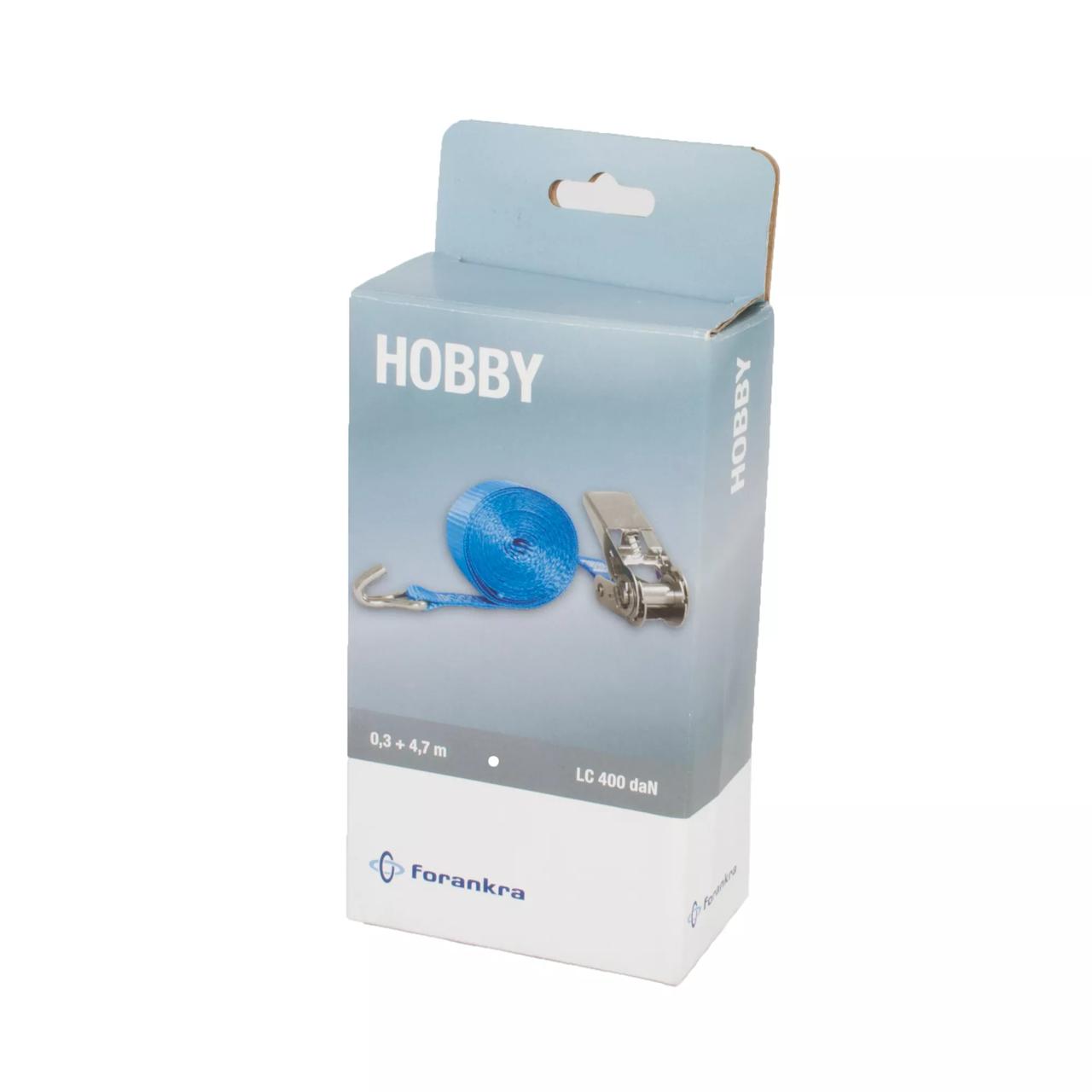 Vår minsta surrning Hobby är ett spännband med en liten och kompakt spännare. Hobby används för lastsäkring av lättare laster på takräcken, släp och för annat hobbybruk.
