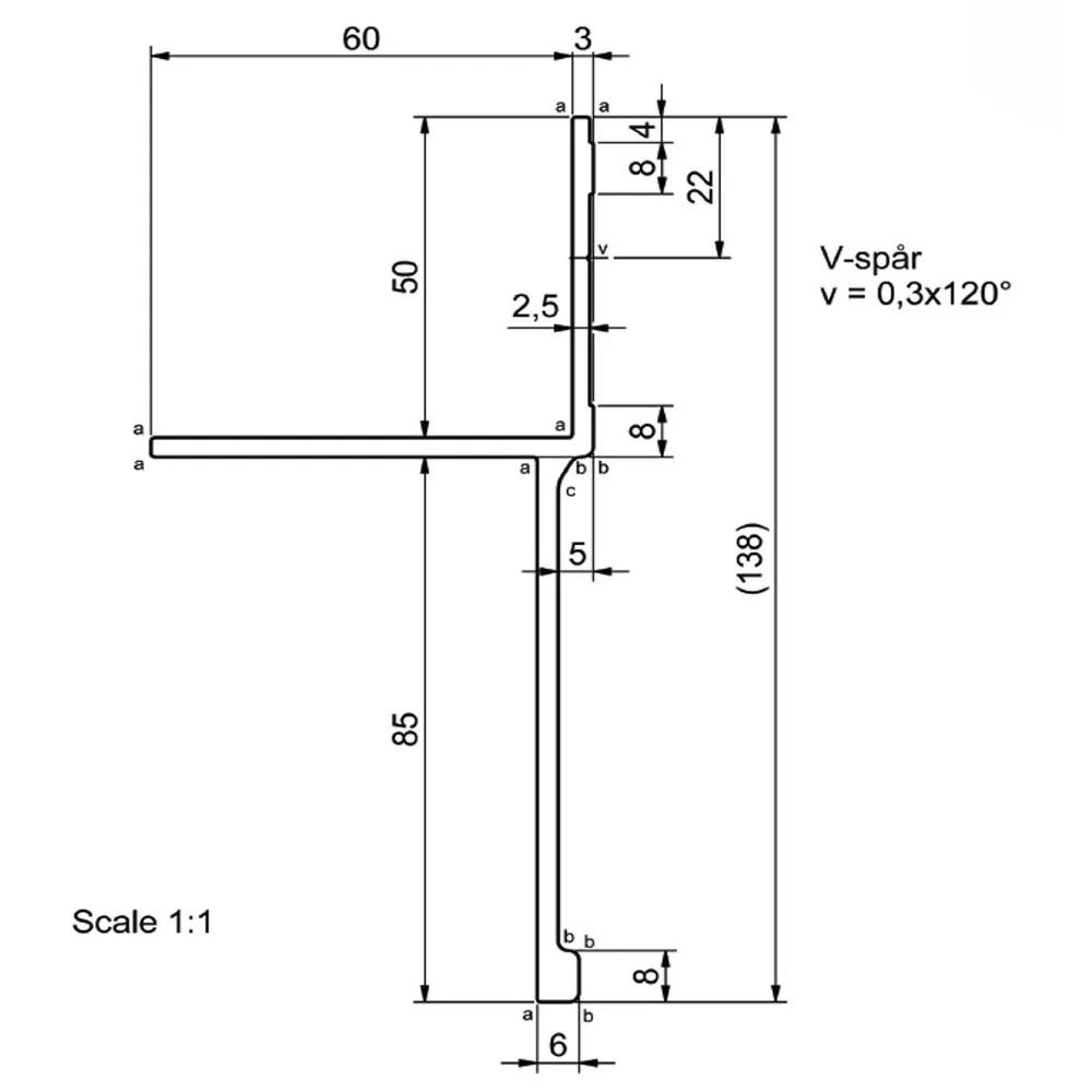 Kantlina 60x138 mm L=4500 mm | 1,634 kg/m eloxerad | Aluminiumprofil AW-6063 T6