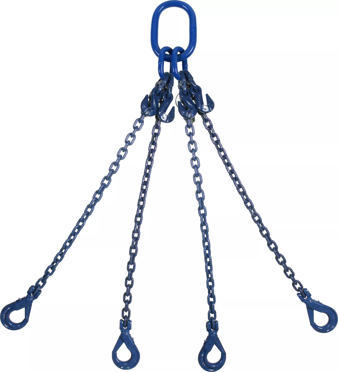 4-parts kättingredskap i klass 10 med säkerhetskrokar och förkortningskrokar. Observera att angiven maxlast gäller under förutsättning att parterna är lika belastade.