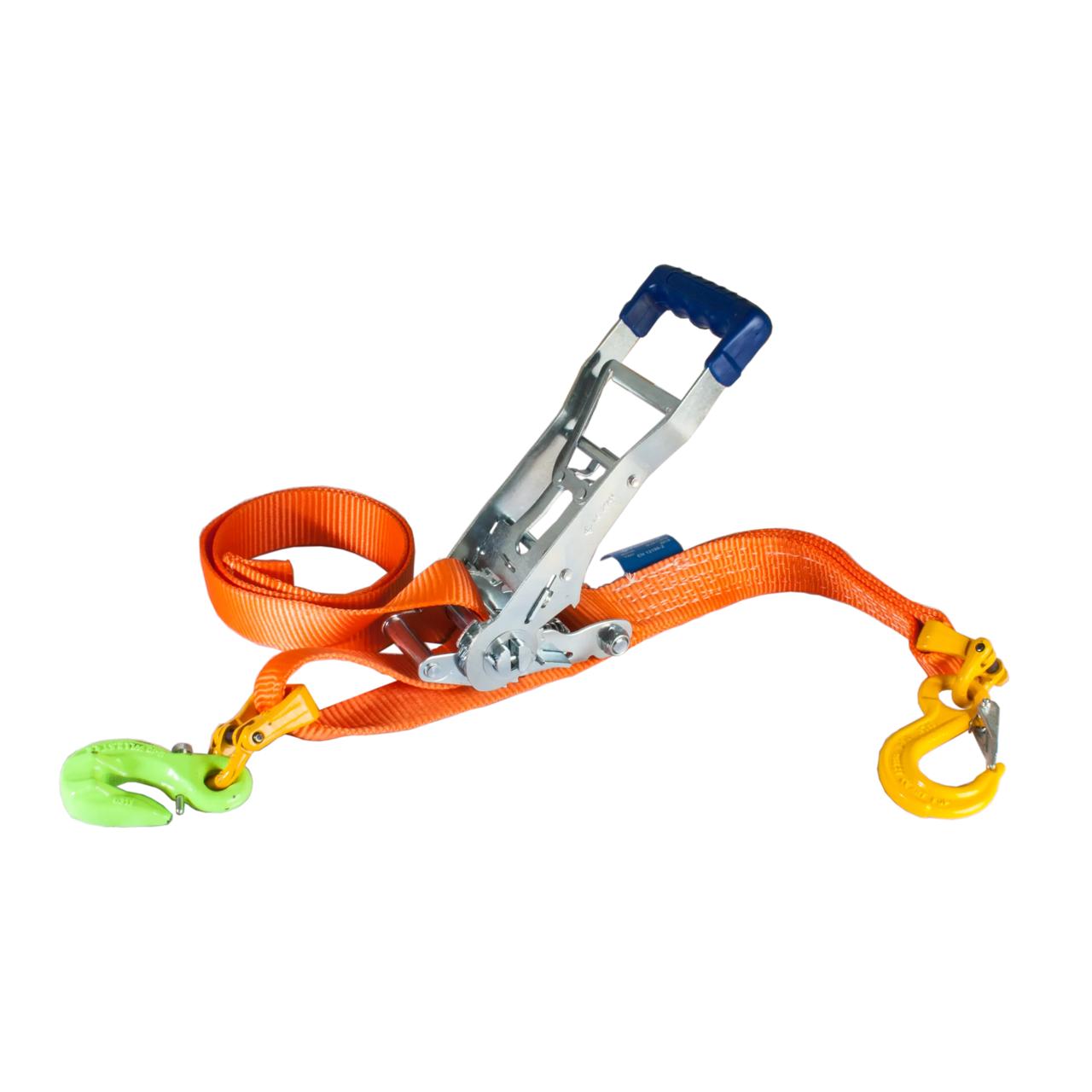 Kättingspännare av band med ratchet är enklare att hantera än en traditionell load binder och gör att du sparar tid vid lastning och lossning. Kättingspännarens krokar är avsedda att användas ihop med 8mm kortlänkad surrningskätting. Märkning och utförande i enlighet med SS-EN 12195-2.