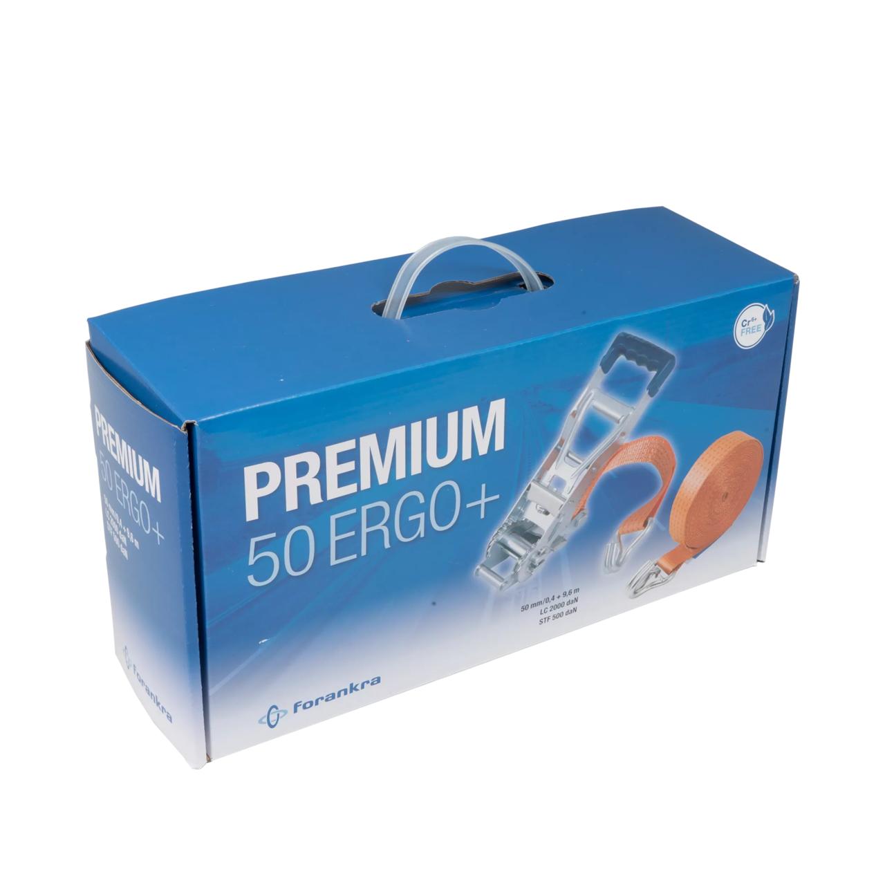 Premium 50 2000 ERGO är en surrning för tyngre transporter och proffsbrukaren. Premium Ergo+ har omvänd inspänning för att skapa en naturlig arbetsrörelse och skapar högre STF. Surrningen har en spännare som är utrustad med ergonomiskt handtag. Långdelen har krok med spärr för enkel användning. Bandet är stämplat Forankra PREMIUM LC 2000 daN. Alla ingående komponenter är utprovade och av mycket god kvalitet för att garantera en lång livslängd och hög säkerhet. Ytbehandlingen av metalldelar är helt Cr 6+ fri. Bandet är tillverkat av höghållfast polyester med en tät vävstruktur, vilket gör surrningen mycket smidig och slitstark.