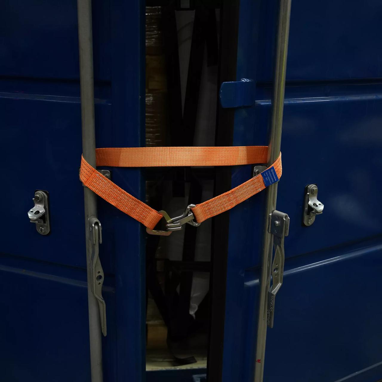 Ett specialsytt säkerhetsband som fästes i containerdörrarna innan öppning. En av de vanligaste olyckorna vid containerhantering är när dörrarna är utsatta för hårt tryck och flyger upp när containern öppnas. Detta kan leda till allvarliga olyckor och denna produkt är en billig försäkran emot detta. Den smidiga konstruktionen med en krok och säkerhetsspärr gör att säkerhetsbandet håller sig kvar på sin plats när dörrarna öppnas och eventuell kraft motverkas av bandet.