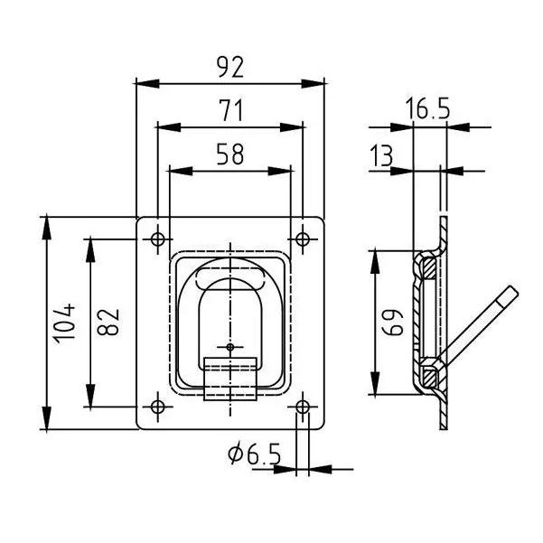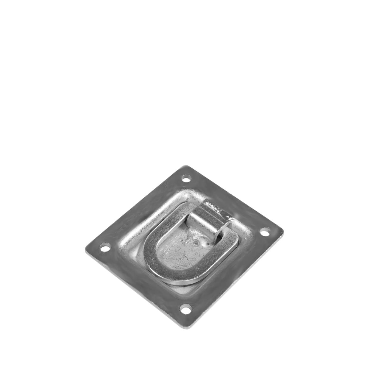 Beskrivning Surrningsfäste nedsänkt , 4 monteringshål, D-ring med påsvetsat överfall. I linje med EN12640