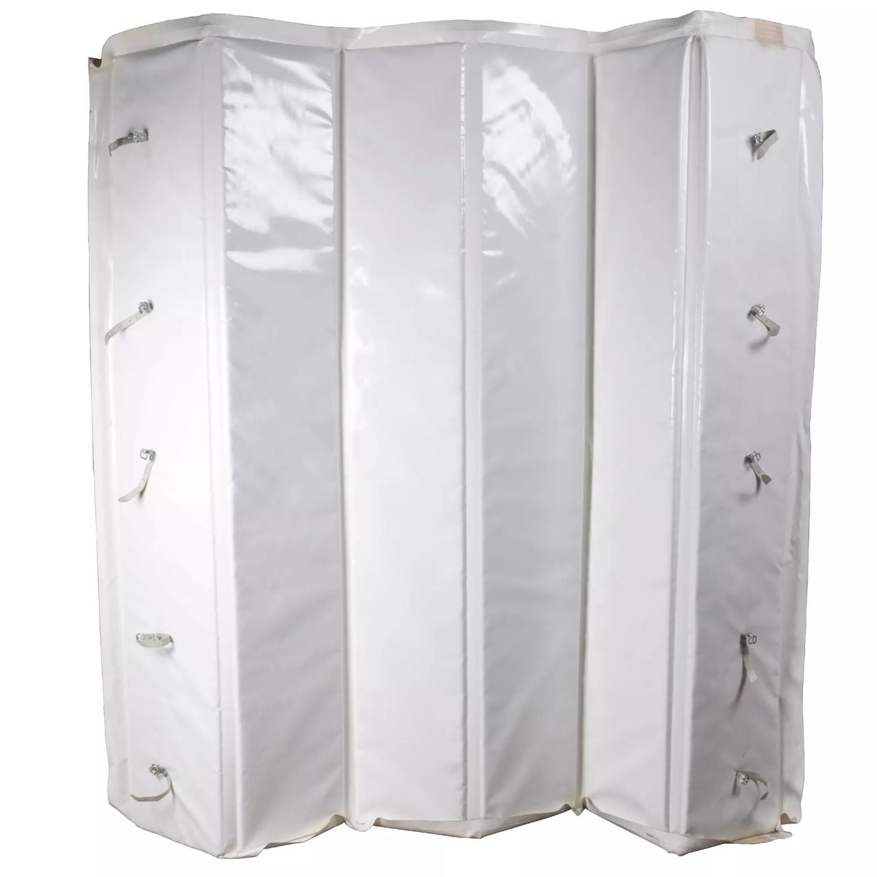 Vikväggen är tillverkad i ett slitstarkt och lättskött ytmaterial, Plastbelagd polyesterväv. Väggen har en hög isoleringsförmåga som ger en god isolering mellan temperaturzoner. Isolationsmaterialet har ett Thermal Conductivity värde om 0,042 W/mK. Monteras med en godsstötta i var ände av vikväggen med hjälp av remmar. Kombinationen gör att man får en flexibel lättflyttad vägg som passar olika lösningar. För väggar över 2650mm monteras det in en aluminiumskena för att "styva" upp hela konstruktionen. Väger ca: 2,2 kg/m². Färg: Vit, grå, blå efter önskemål. Tillverkas mot order i önskad storlek.