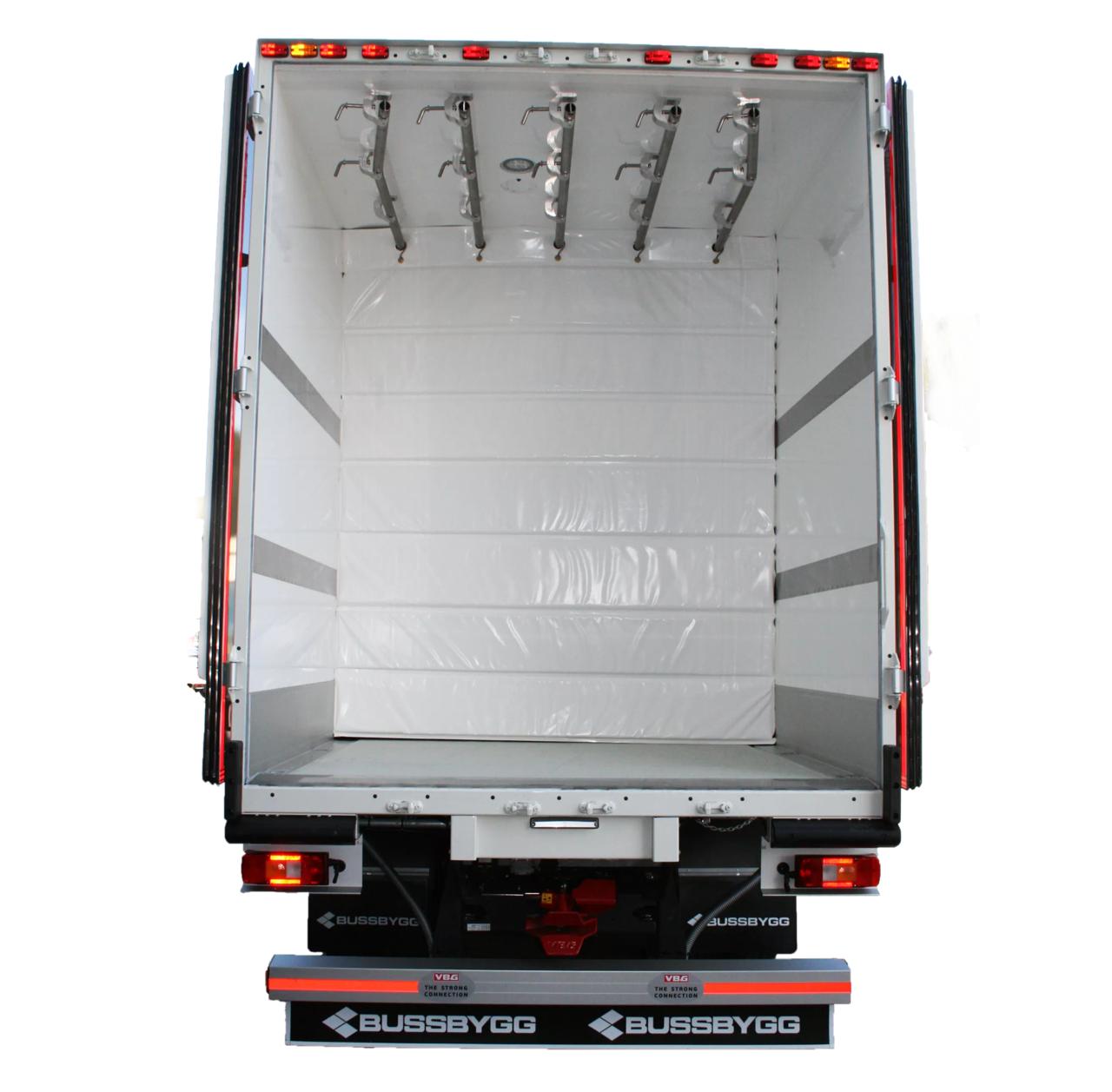 Vikväggen är tillverkad i ett slitstarkt och lättskött ytmaterial, Plastbelagd polyesterväv. Väggen har en hög isoleringsförmåga som ger en god isolering mellan temperaturzoner. Monteras med en godsstötta i var ände av vikväggen med hjälp av remmar. Kombinationen gör att man får en flexibel lättflyttad vägg som passar olika lösningar. Denna modell anpassas för lastbärare med hängande rörsystem i taket. Vikväggen väger ca: 2,2 kg/m². Färg: Vit, grå, blå efter önskemål. Tillverkas mot order i önskad storlek.