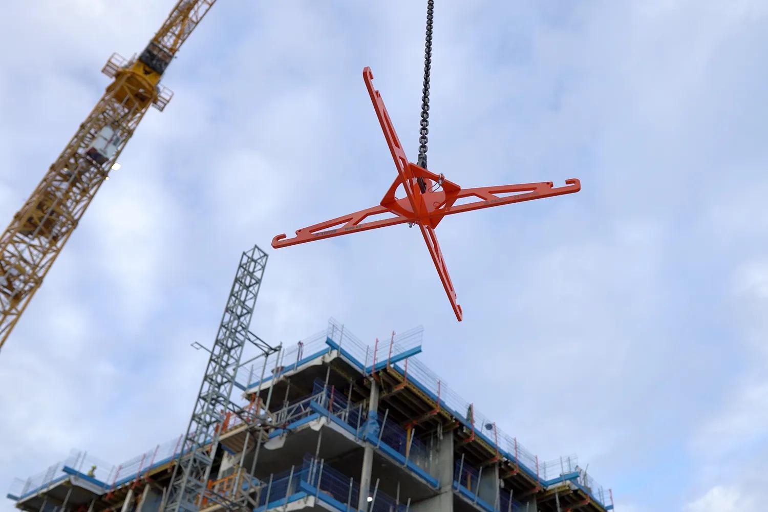 Många greppvänliga handtag gör det smidigt att hänga kroken på kranen. Vid lyft av storsäckar skonas stropparna och säcken för belastningen blir rakt upp och jämt fördelat på dom fyra hakarna. Pallar går också bra att lyfta med X-2500, viktigt att använda fyra stroppar som är lika långa i var sitt hörn av pallen. Pallkragar och gods trycks inte ihop vid lyft med X-2500.